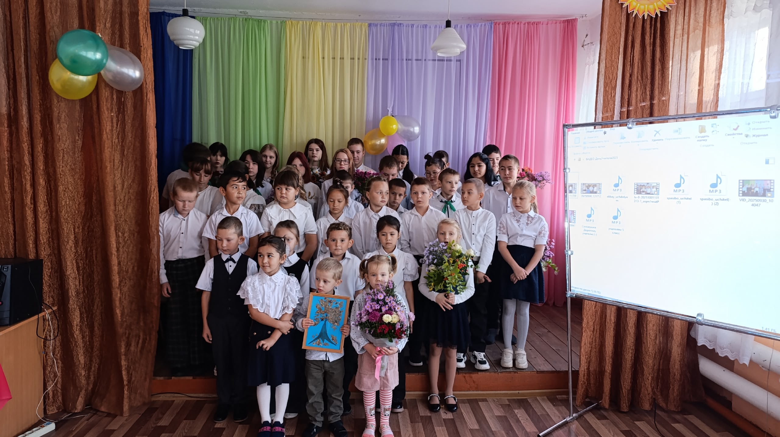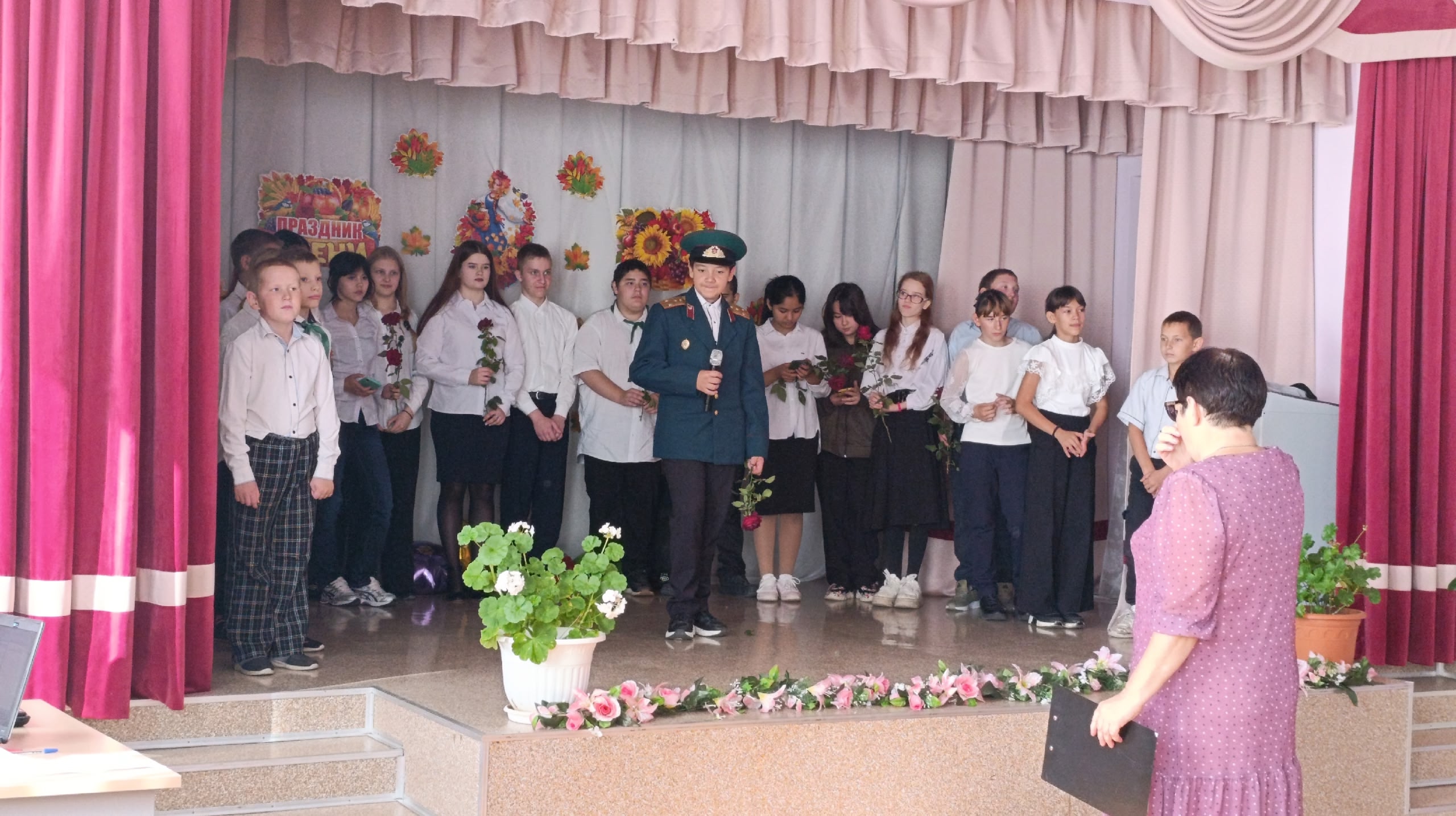Звучали поздравления от воспитанников детского сада, исполнялись зажигательные музыкальные номера — песни о школе и учителях в исполнении коллективов младшего, среднего и старшего звена.