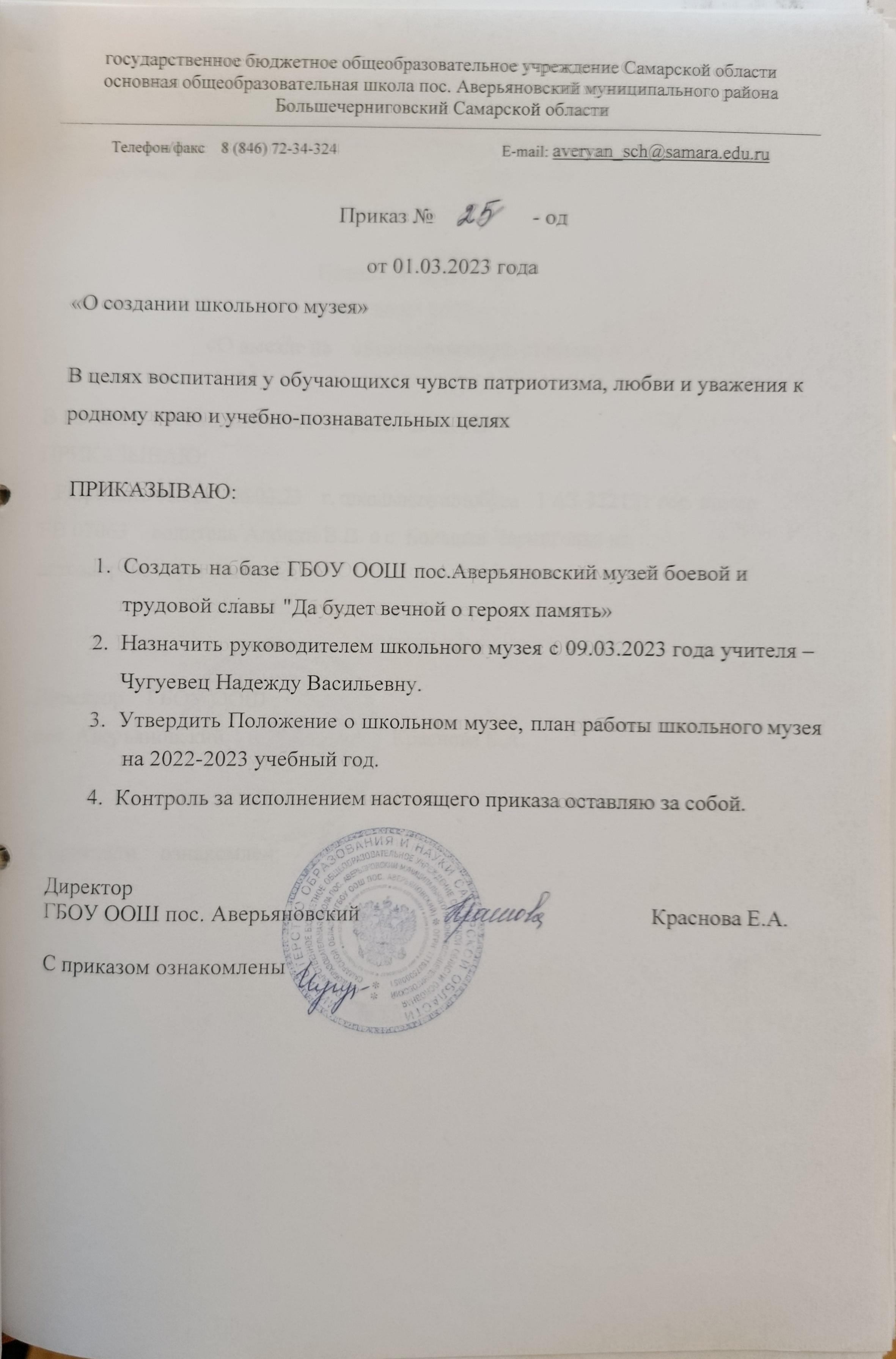 Приказ о создании школьного музея
